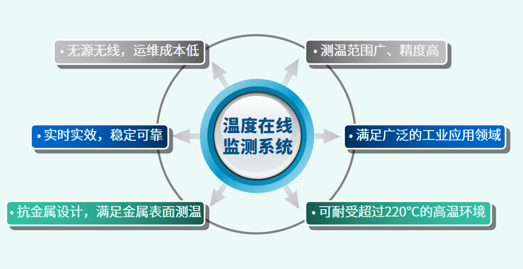 温度传感器拥有超过220℃耐高温性能,其与一次设备同寿命,具有精度高、范围广、不带电池、数据稳定可靠、安全免维护等特点。可嵌入或表贴在带电导体上,实现电力一二次设备的真正融合,解决了其他测温方式破坏设备绝缘结构、易受电磁干扰、测温不稳定、范围有限等缺点。